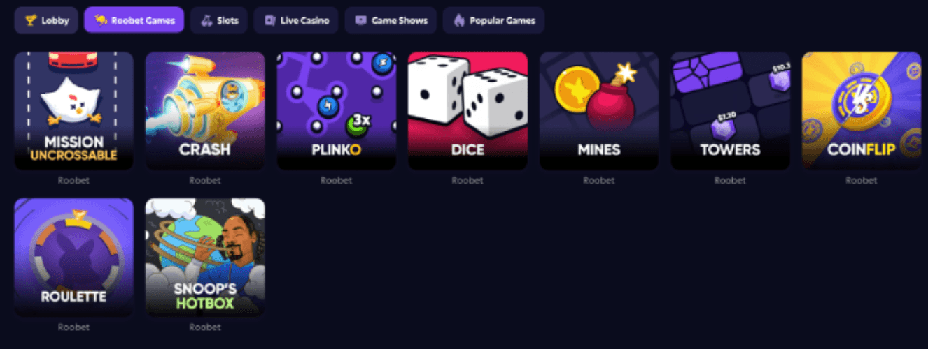 Under the Roobet Games tab, you will find a small collection of crash games powered by Roobet Studio. Crash gambling enthusiasts can try out their luck with Plinko, Dice, Roulette, Crash, Mines, Mission Uncrossable, CoinFlip, Jungle Mines, Towers, and Snoop’s Hotbox. The latter was created in collaboration with Snoop Dogg, and like the rest, they can only be played at Roobet.