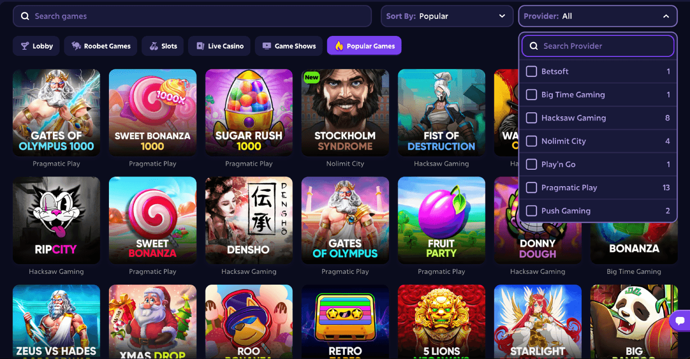 Roobet casino is home to 4794 slot games powered by 65 studios. To find your favorite slots, you can group/sort them by provider, popularity, or release date. There’s also this feature labeled “I’m feeling lucky”. If you don’t know what game to play, this feature will randomly direct you to one.